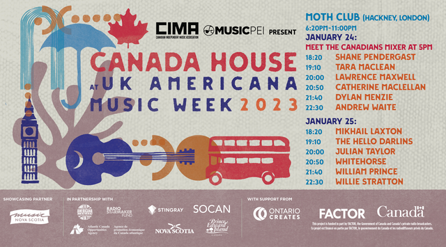 On a bitterly cold January night, the RGM team are in London’s Hackney, where I’m pleased to report, despite the multiple issues of recent years, live music is thriving with a wide variety of venues still hanging in there. Moth Club is one such venue, tucked away just off the main street but still, very much, part of the bustling Hackney ambience. The reason for our visit this evening is the first of two nights showcasing some of the very best Americana and Roots music Canada has to offer as part of Americana UK Music Week (that’s Americana Fest to you and me) hosted by CIMA (Canadian Independent Music Association) in partnership with Music PEI. Twelve acts over two days with a good mix of old favourites and new blood, so let’s dig in to Canada House.